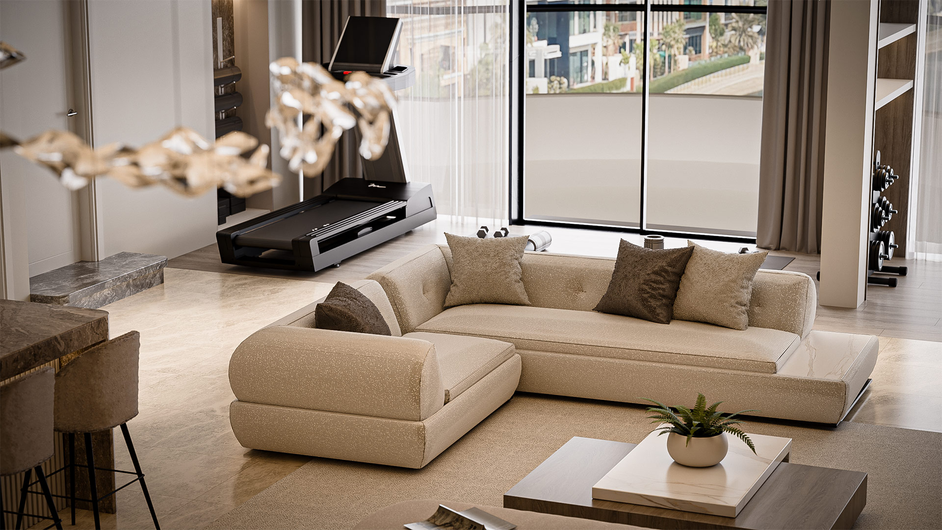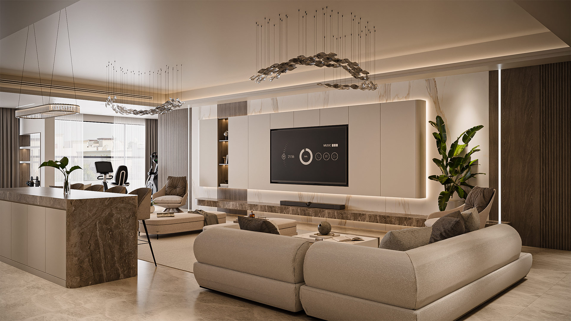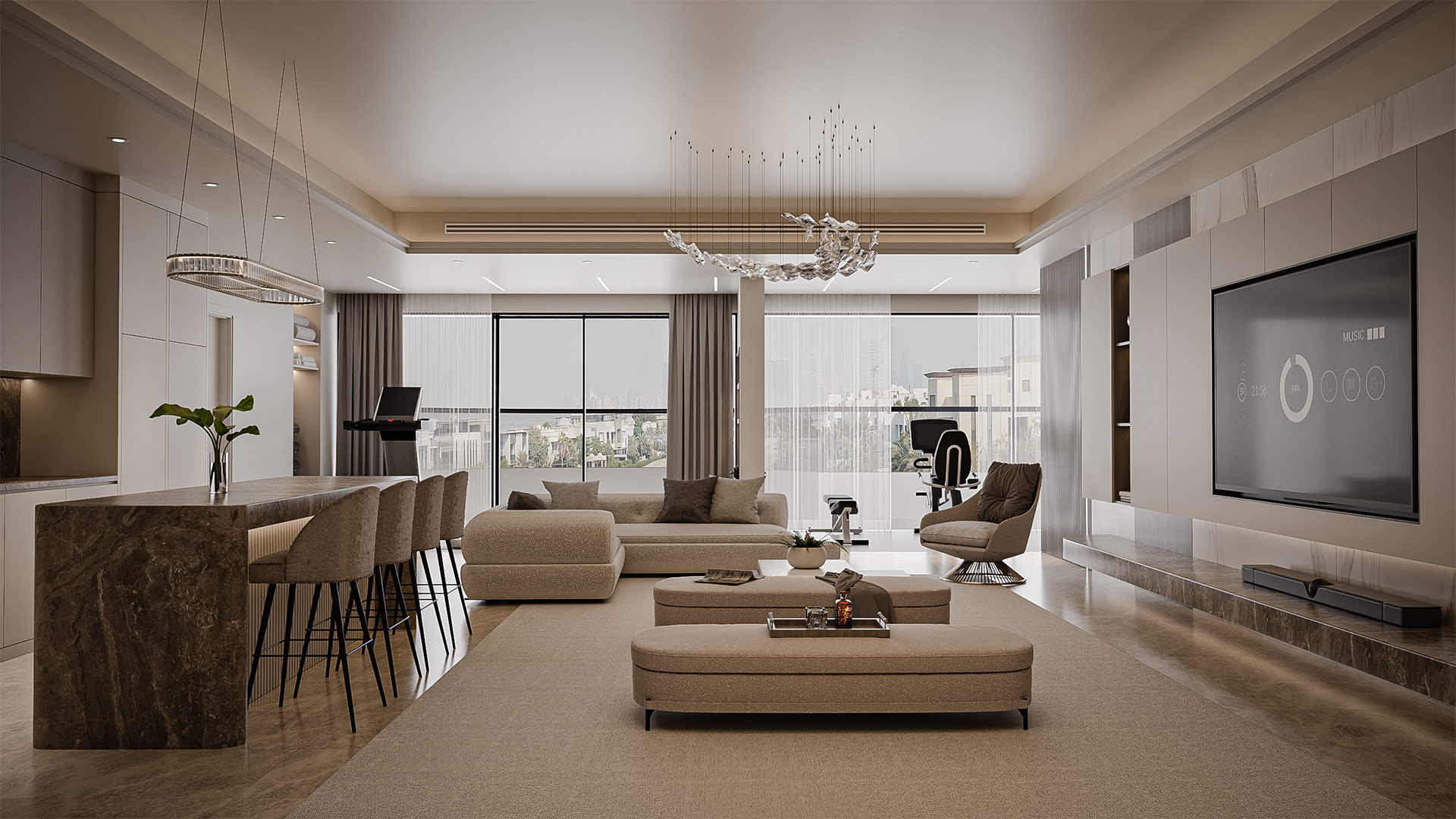 The layout features a spacious living hall with a cozy lounge area, a gym corner on the left side, and an open kitchen with a sleek bar counter, seamlessly blending functionality with elegant style.