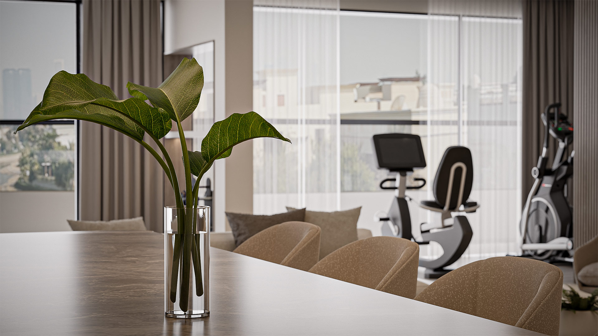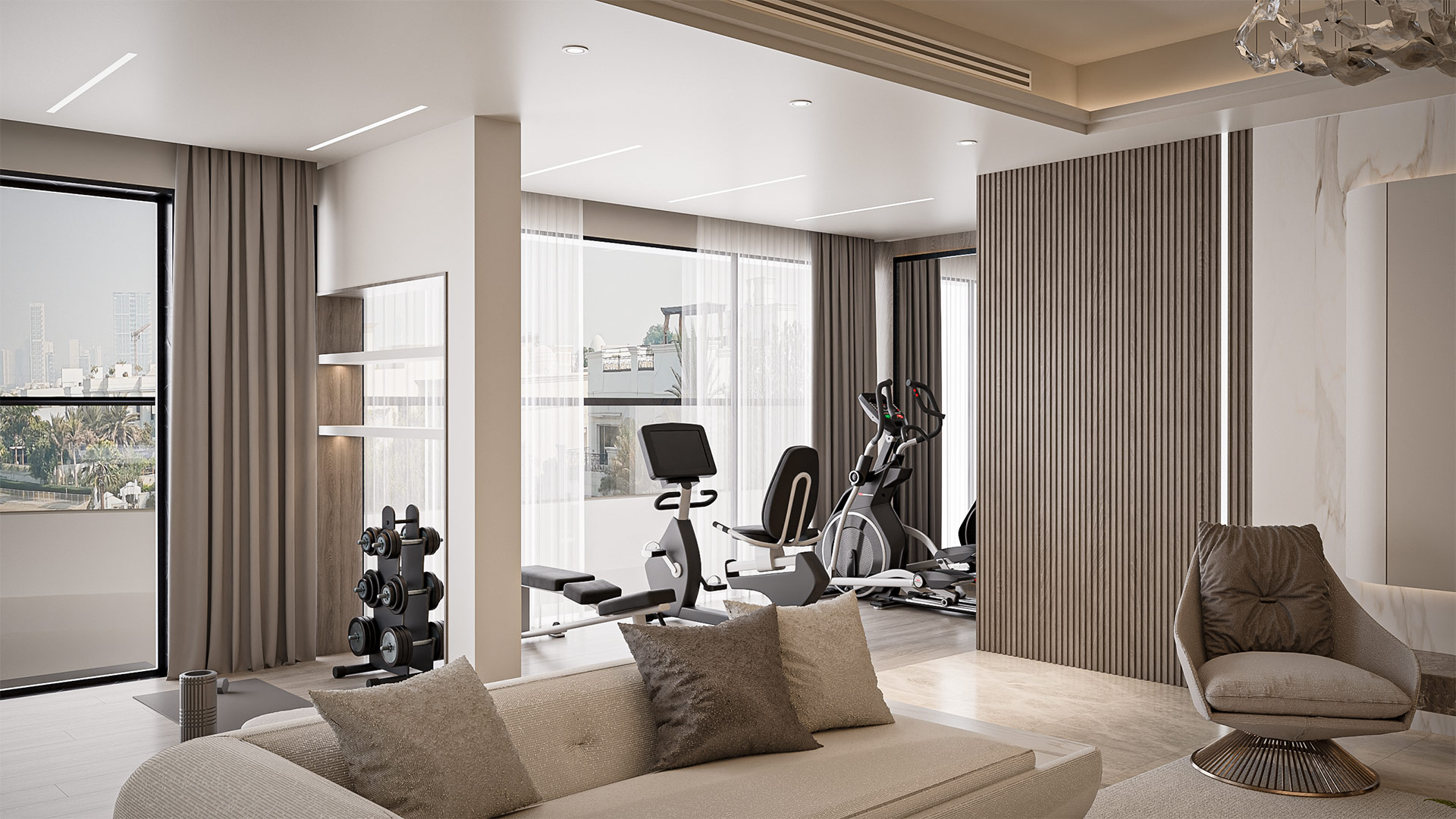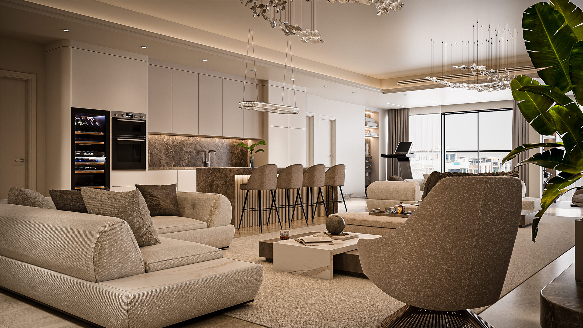 The layout features a spacious living hall with a cozy lounge area, a gym corner on the left side, and an open kitchen with a sleek bar counter, seamlessly blending functionality with elegant style.