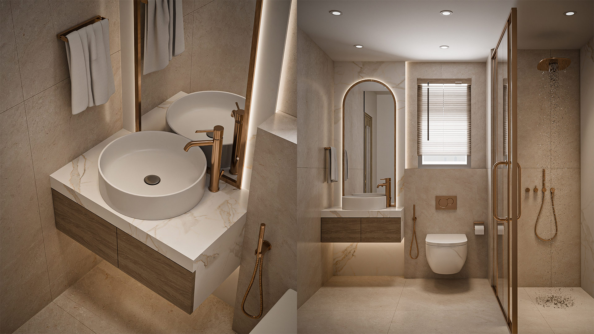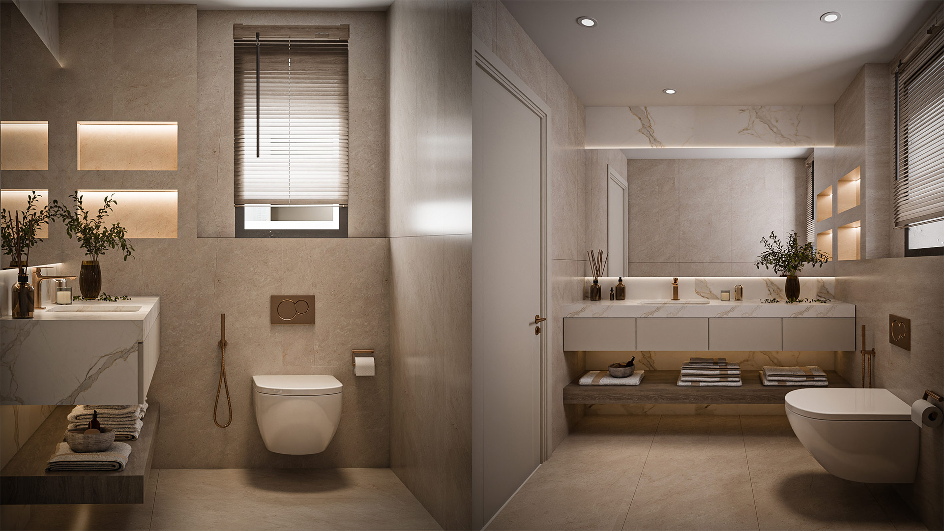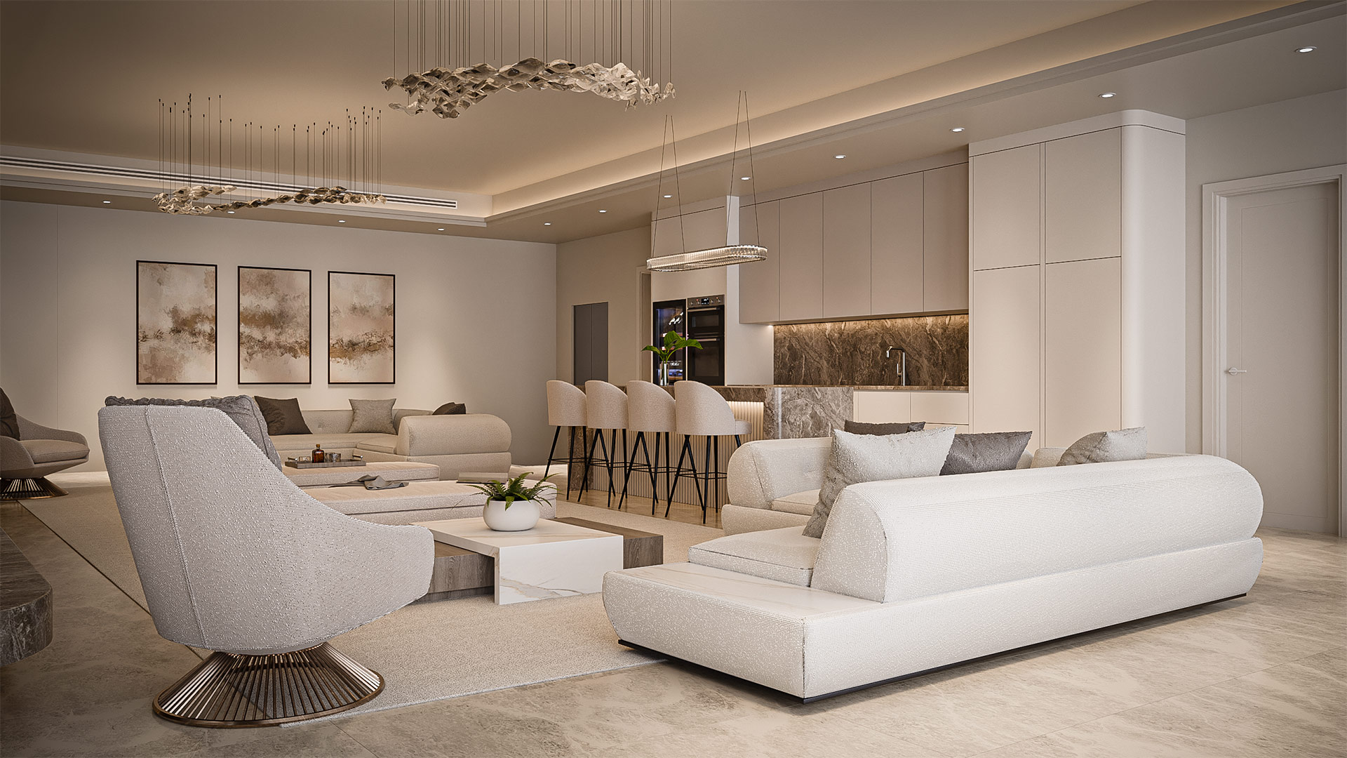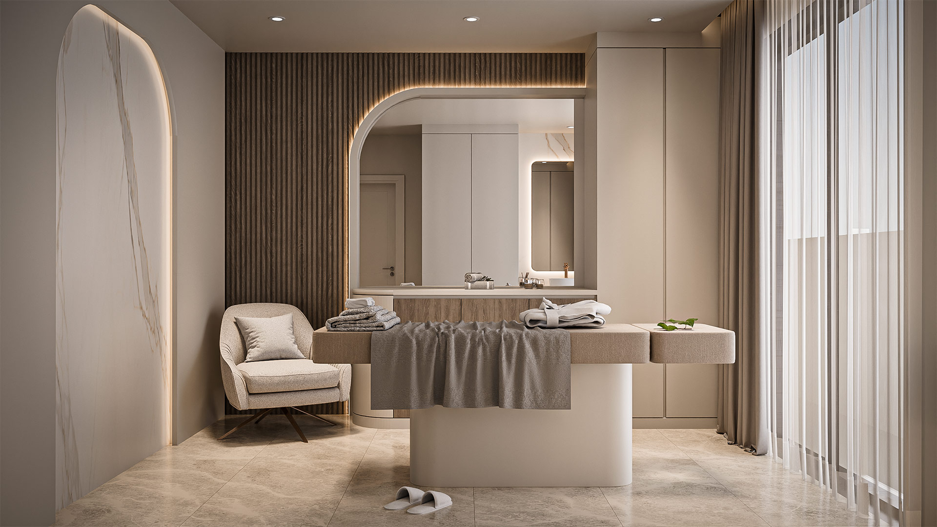 The material palette highlights beige marble flooring, light oak wood finishes, and soft fabric textures that enhance comfort and warmth. Subtle lighting details, marble accents, and modern furnishings complete the tranquil and contemporary ambiance of the space.