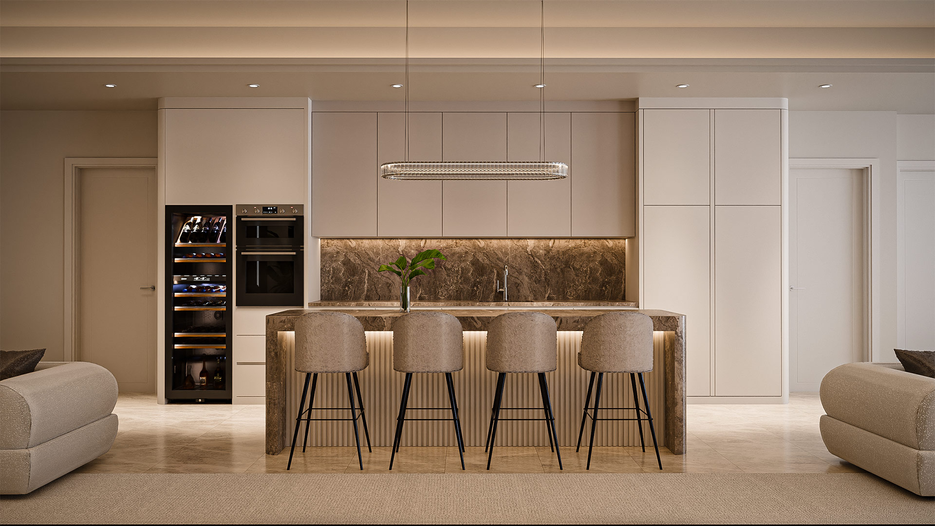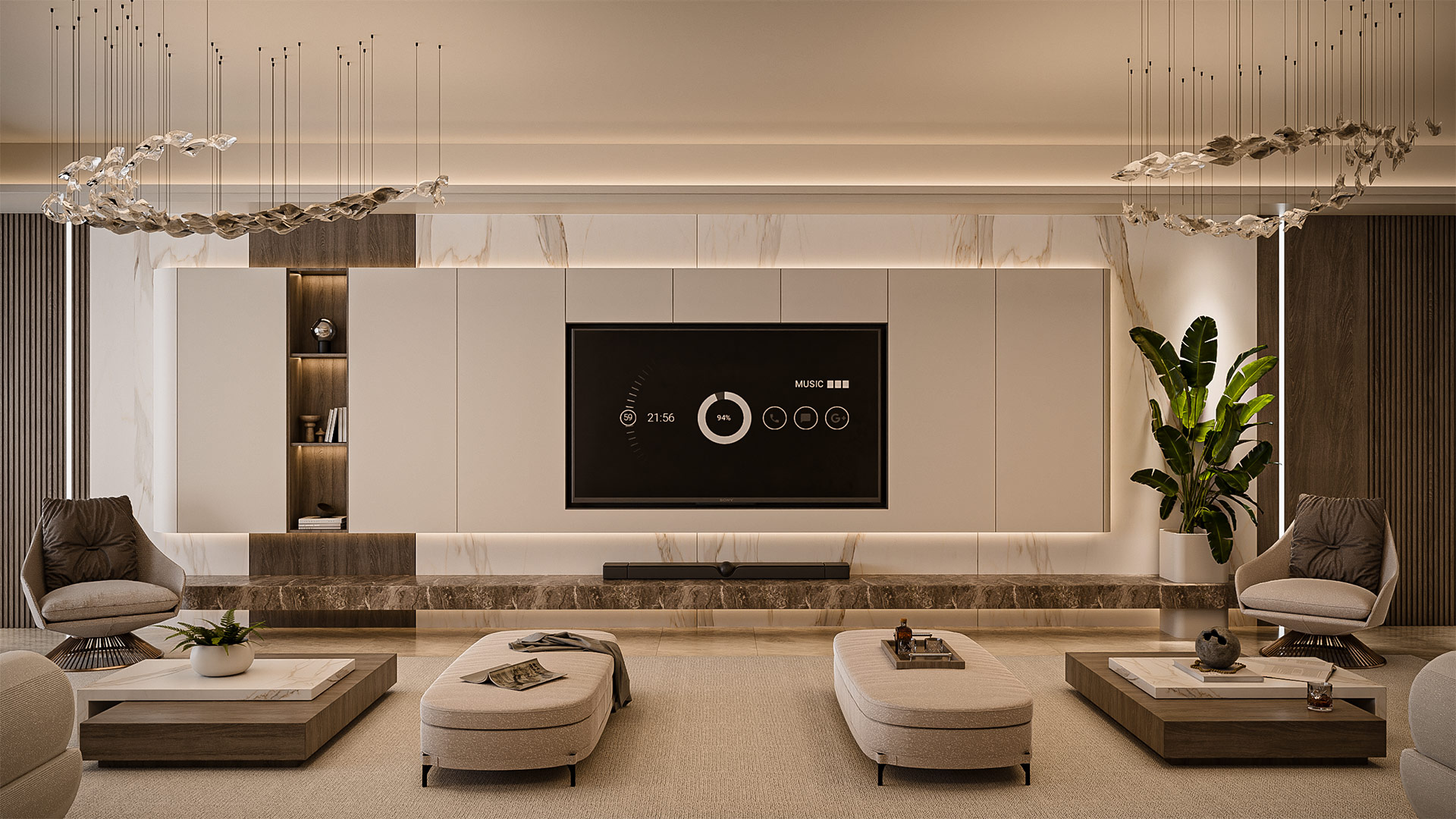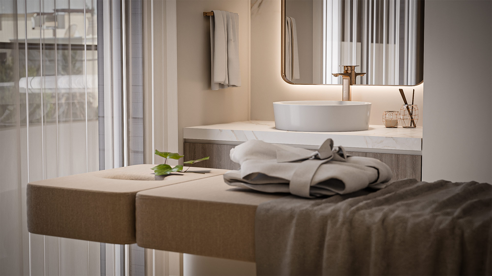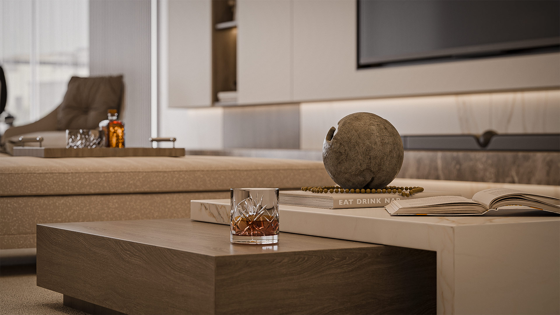 The material palette highlights beige marble flooring, light oak wood finishes, and soft fabric textures that enhance comfort and warmth. Subtle lighting details, marble accents, and modern furnishings complete the tranquil and contemporary ambiance of the space.