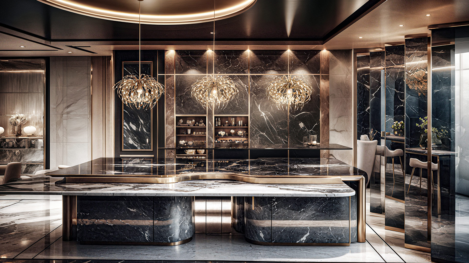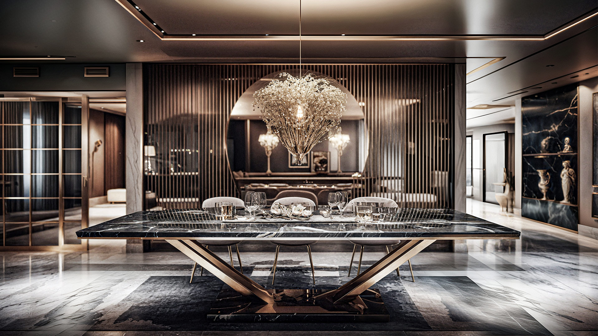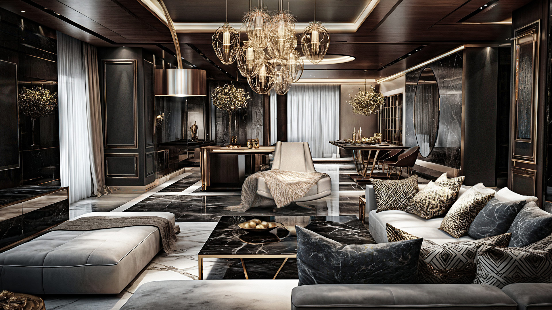 The design highlights rich materials like dark wood and polished marble, complemented by elegant lighting and tailored furnishings. The open-plan living and dining areas are crafted for both grand impressions and comfortable living, reflecting a commitment to high-quality design and a refined aesthetic.