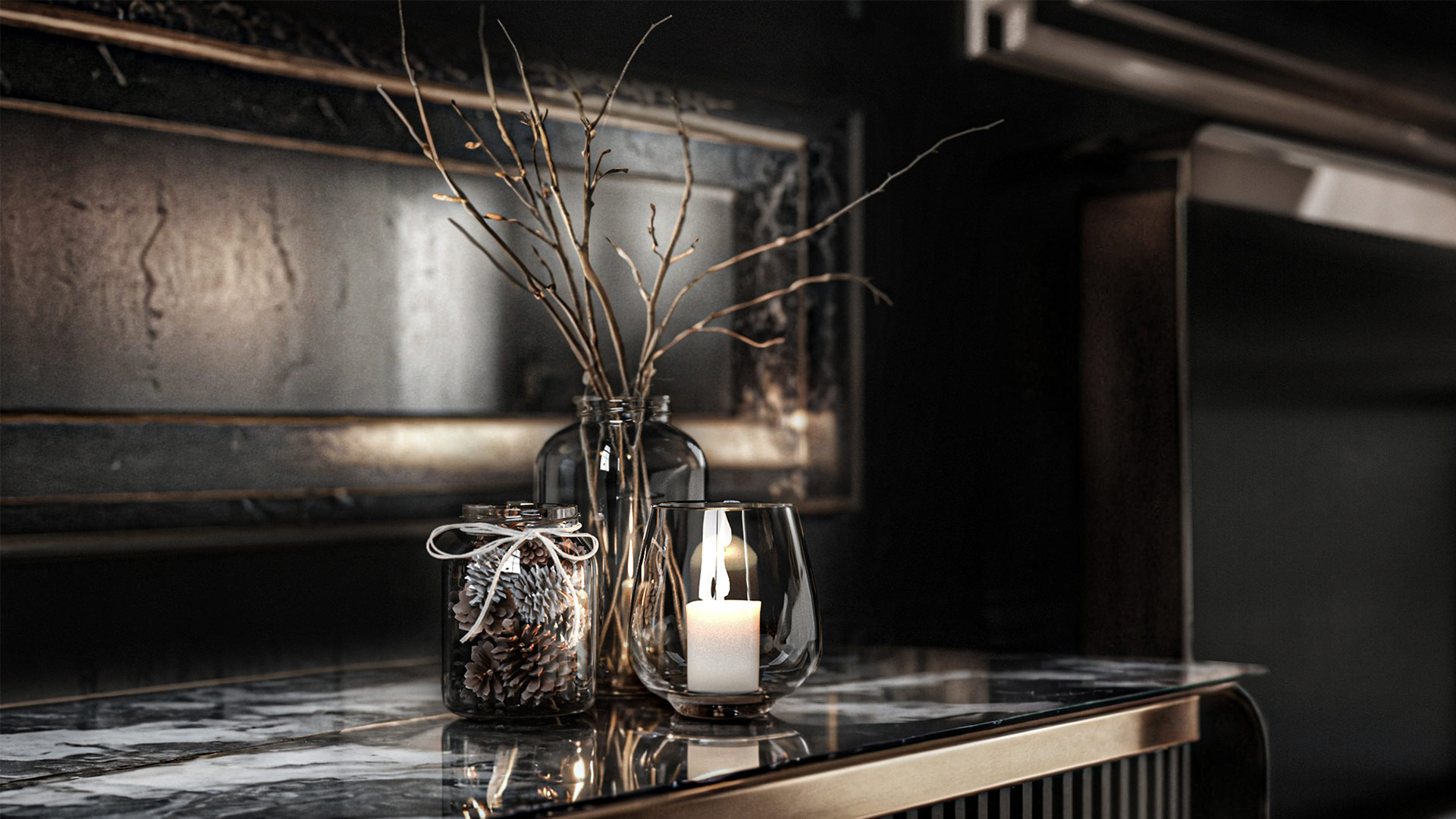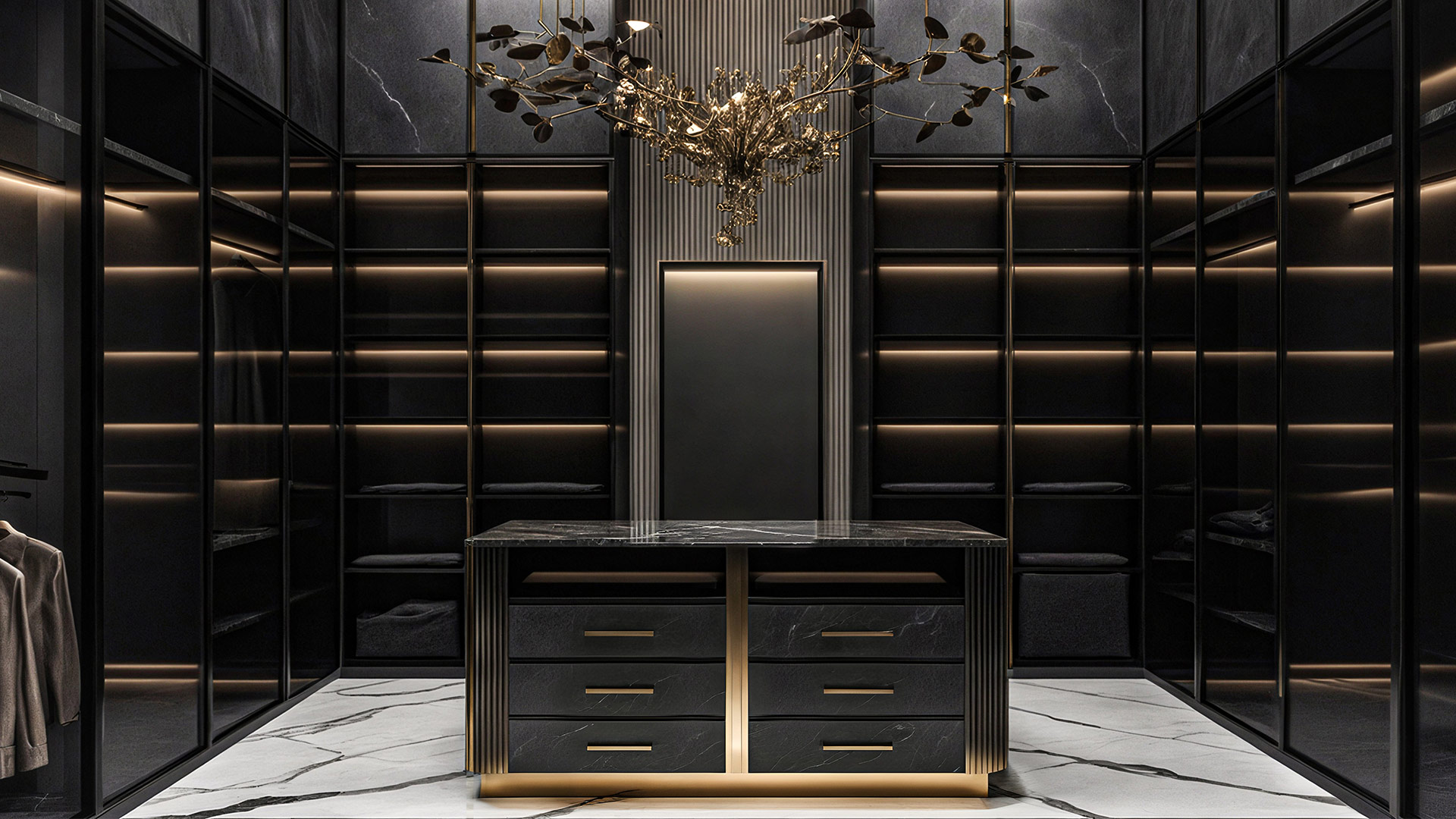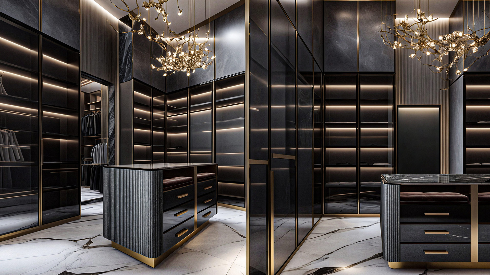The design highlights rich materials like dark wood and polished marble, complemented by elegant lighting and tailored furnishings. The open-plan living and dining areas are crafted for both grand impressions and comfortable living, reflecting a commitment to high-quality design and a refined aesthetic.